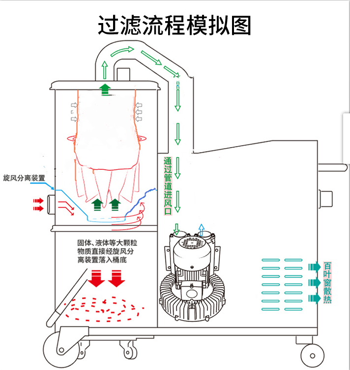 ⑥ 吸鐵屑用大功率工業(yè)吸塵器動(dòng)力系統(tǒng)為保證設(shè)備的高壓動(dòng)力、持續(xù)續(xù)航。風(fēng)機(jī)方面采用國(guó)際先進(jìn)的精鑄渦輪風(fēng)泵,.此款風(fēng)泵采用了風(fēng)冷式雙旁路(Bypass)的散熱系統(tǒng),這樣的設(shè)計(jì)可以讓電機(jī)和風(fēng)泵在使用過(guò)程中一直保持恒 溫狀態(tài),使電機(jī)可連續(xù)工作24小時(shí)。 風(fēng)泵進(jìn)、出風(fēng)口處安裝有多頻消音器,讓您有一個(gè)安靜的工作環(huán)境。電機(jī)采用國(guó)產(chǎn)西門(mén)子電機(jī),寬壓雙頻(50/60Hz),高可靠、低噪音、長(zhǎng)壽命。